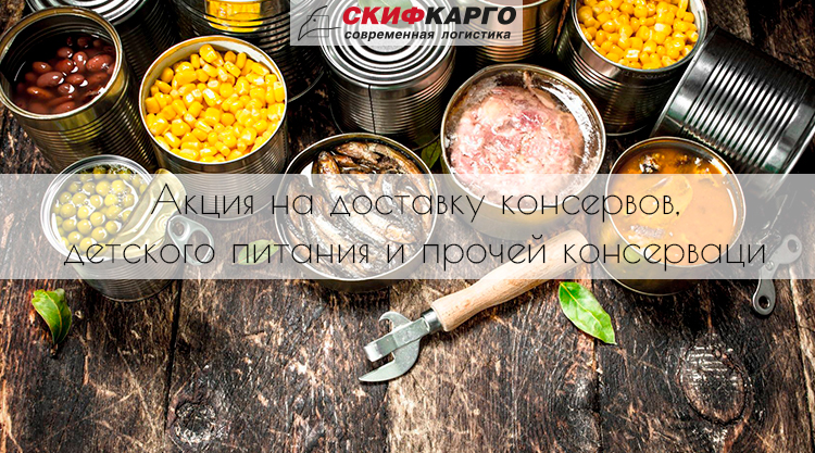 Компания «Скиф-Карго» предлагает скидку в размере 20% для новых клиентов на доставку консервов, детского питания и прочей консервации.